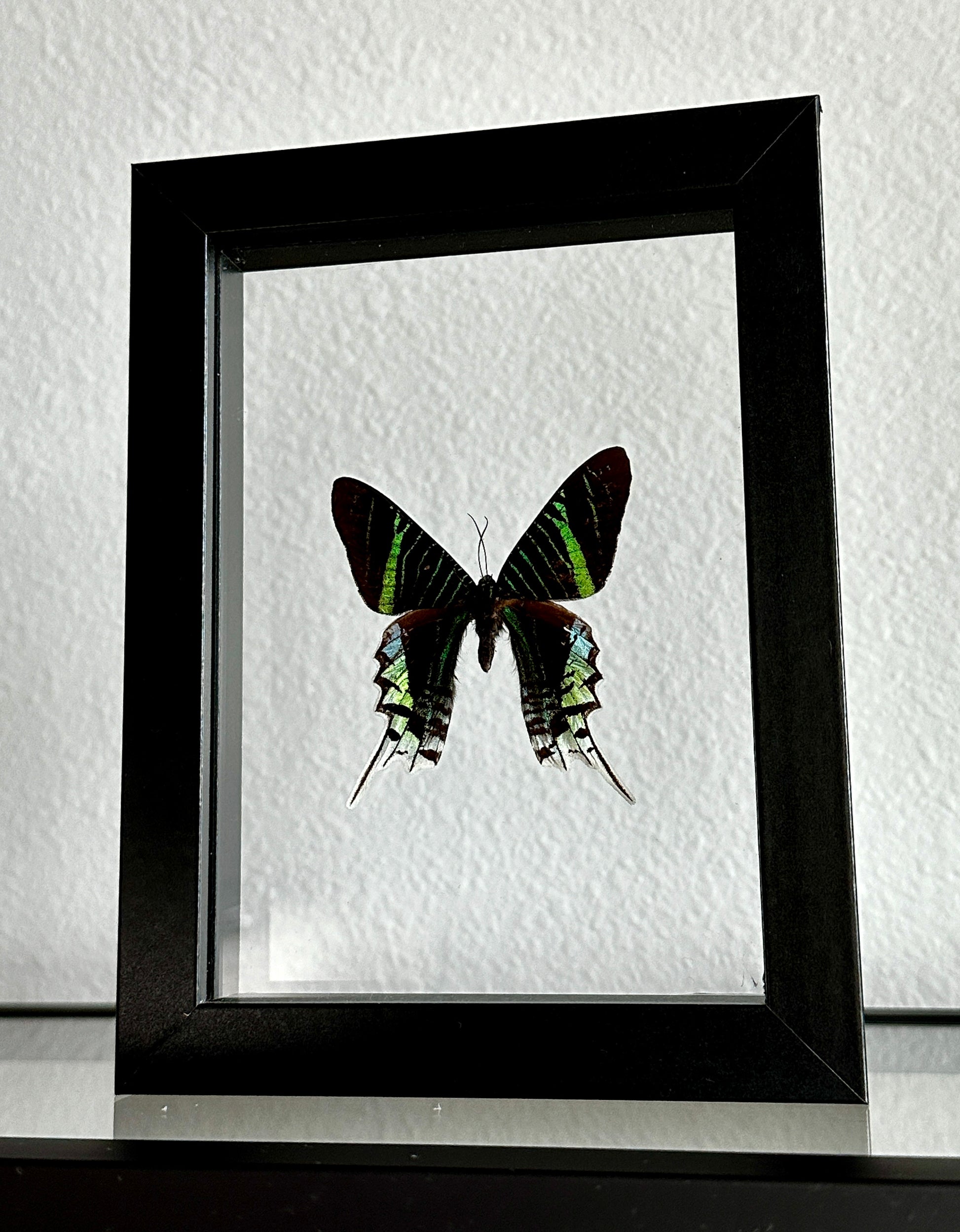This stunning Green-Banded Urania moth has been hand-pinned and mounted in a 5" x 7" floating glass frame. Native to South America, this specimen was ethically sourced from a conservatory located in the region.